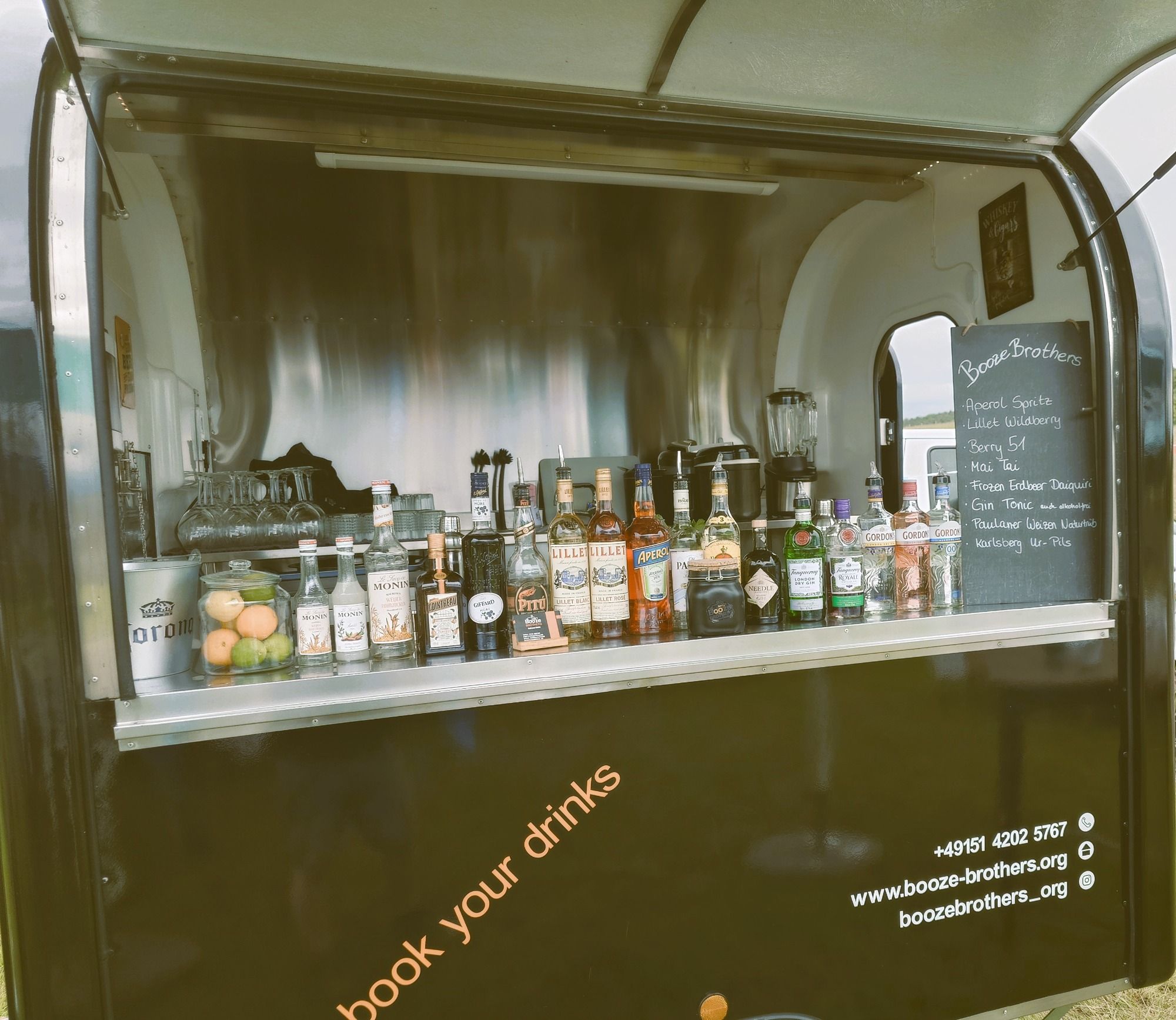 Wir bringen alles mit, Getränke, Gläser, Zutaten, Equipment und auch einen Anhänger, der als mobile Bar dient.